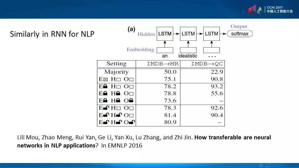 在哪里做迁移的转换、自适应。可以在某个层次来做,也可以在多个层次来做,如何来衡量两个领域之间的距离,可以用鲜艳的这种概率、模型,也可以用联合概率、模型,另外还可以将源领域的信息加进来,建立一个更准确的Loss。这都是图像领域获得的知识,那自然语言会不会有类似的方式呢?