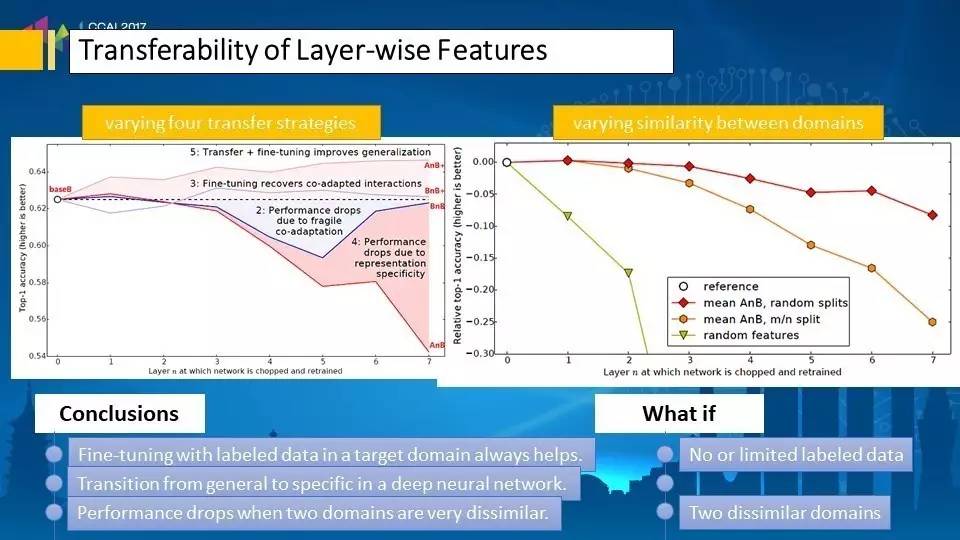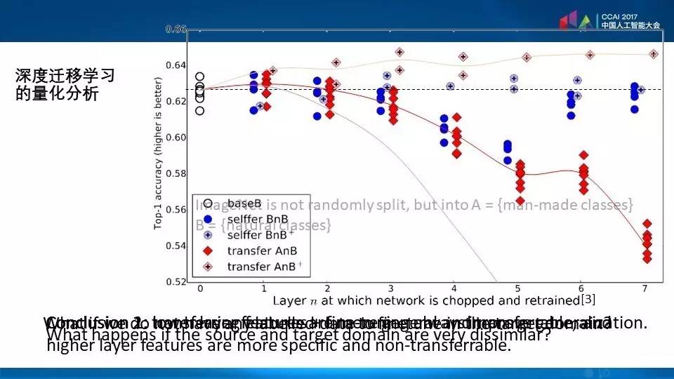 也有人把这个工作系统地进行了比较,我们可以看到代表迁移能力的红色是逐层下降的,从左到右逐层加深,如果是以深度学习的模型,下层在图像上比较容易迁移,在上层就不容易。我们在当中也可以做各种各样的演算和变化,比如说我们可以让迁移过来的参数,让它在之后的领域里面再得到重新的训练,这样就会得到上面的这条线,我们这个线放得越宽迁移能力就会变得越强,如果两个领域之间相差太大了,那么这个迁移是没办法进行的,就像下面的这条蓝线直线下降,这个能力就不行。