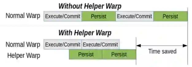 作者提出了 Helper warp 这个概念,它由位于片上共享内存中的提交缓冲区组成,事务提交将被重定向到该缓冲区。这将从关键路径中移除时间开销,使持续性操作更快。作者还提出了一种方法,使辅助器仅在需要最好性能时才使用。在某些情况下,阈值可能高达每秒数百 GB。这包括今天和不久的将来可用的 NVRAM 带宽范围。