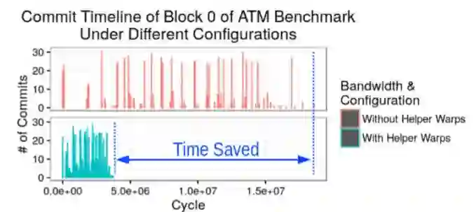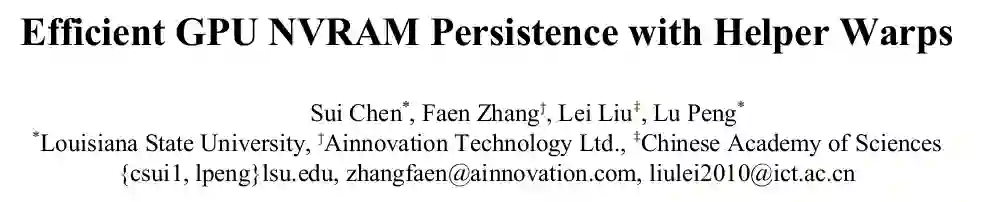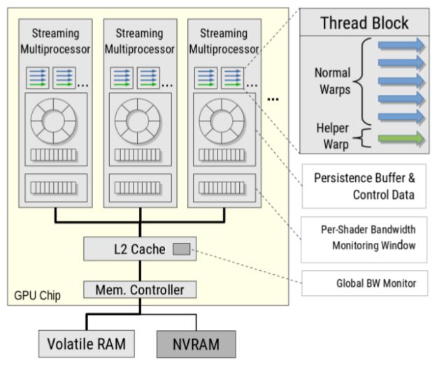 非易失性随机存取存储器(NVRAM)是近年来出现的一种用于弥补主存和外部存储设备之间性能差距的存储器。为了利用 NVRAM 的非挥发性,程序应该允许持久化存储,这意味着在断电事件期间必须保持一致性。利用高度的并行性,GPU 的设计具有高吞吐量。然而,与 DRAM 相比,NVRAM 具有更低的写入带宽,按照原样使用 NVRAM 可能会产生次优的总体系统性能。为了解决这个问题,作者提出使用 Helper Warp(本文中将简单译为辅助调度单位)将持久性移出事物执行的关键路径,从而减轻延迟的影响。在带宽限制为 1.6GB/s 和 12GB/s 的情况下,该机制分别实现了 4.4 倍和 1.5 倍的加速,并且预计即使在 NVRAM 带宽高达数百 GB/s 的某些情况下,也将保持速度优势。