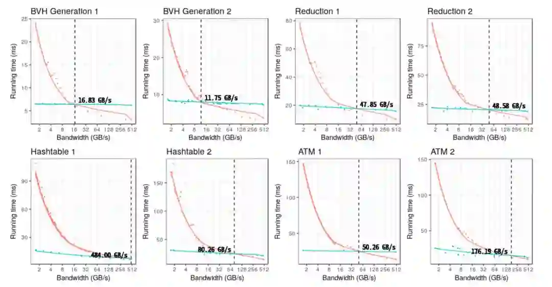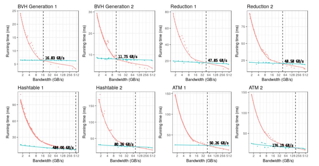 图6 展示了使用实验设置的基准测试的运行时间,包括启用和禁用辅助调度单位。这些线表示运行时间随着 NVRAM 带宽限制而变化的趋势。绿色和红色的线和点分别表示启用和禁用辅助调度单位的运行时间。随着带宽的降低,两种配置的运行时间都会增加。不过,没有辅助调度单位的运行时间最终会增长得更快,并超过启用辅助调度单位的运行时间。这两条运行时间存在交叉点。H1 的交叉点高达 484GB/s(这意味着即使在易失性RAM带宽下,辅助调度单位的性能也会更好),而BVH1的交叉点则低至11.75GB/s。