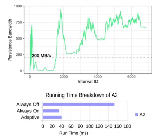 图10:基准测试A2的持续带宽趋势,关闭辅助调度单位(顶部)和3种配置的运行时间细分(底部)