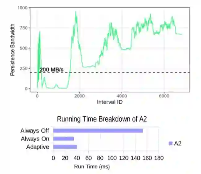 在本文中,作者观察到事务 GPU 程序的性能下降来源于 NVRAM 的带宽限制,这种限制导致了长时间的持久性延迟。当 NVRAM 用作主存的临时替代品时,延迟将直接添加到事务的关键路径上,从而使事务的运行时间更长。此外,这种延迟可能会影响位于相同调度单位的其他线程,从而导致整个基准测试的运行时间更长。