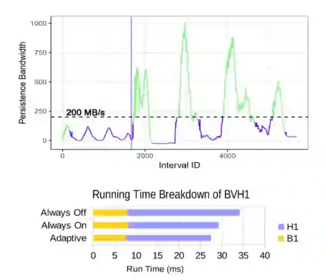 图9:基准测试B1+H1的持续带宽趋势,带有辅助调度单位的自适应切换(上图)和3种配置的运行时间细分(下图)