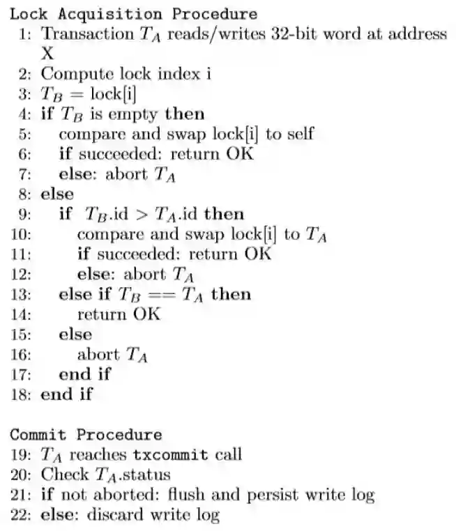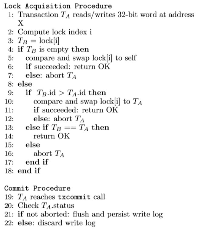 事务处理通常由并发控制和持久性日志记录两部分组成。论文研究的系统采用软件事务内存(STM)进行并发控制。作者提出的 STM 算法采用了快速冲突检测以及重做日志记录,并解决与全局所有权记录的冲突。写/读集跟踪的粒度是一个32位机器字。对较大数据的访问被视为多个 32 位机器字。该算法不区分读与写,并通过支持线程 ID 较低的事务来解决冲突。具体的算法步骤如图 2 所示。