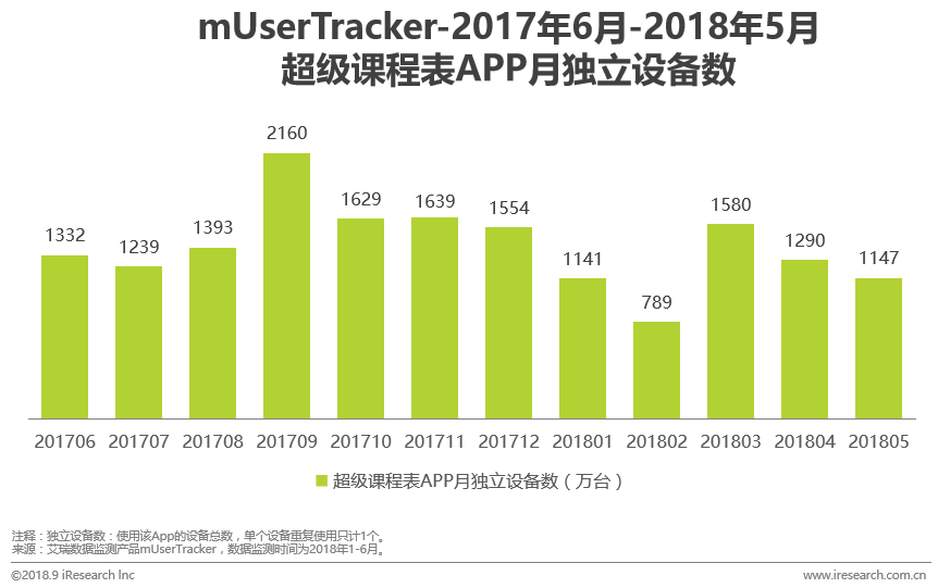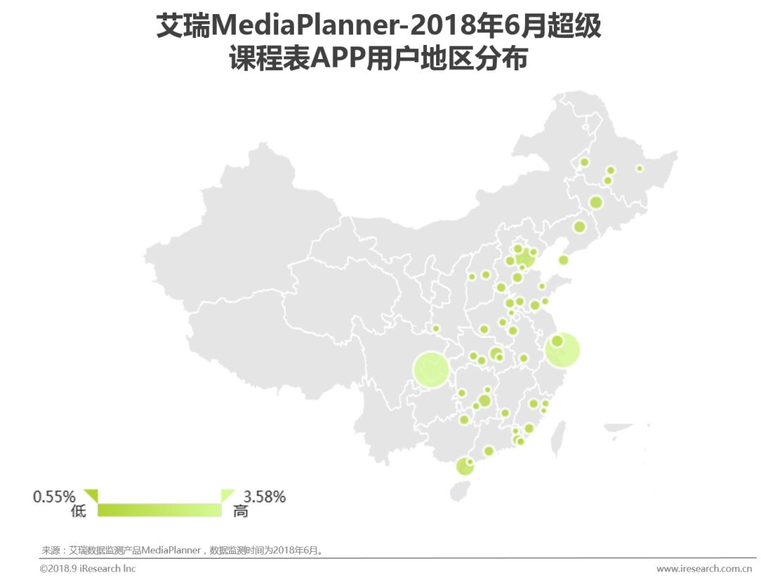 艾瑞监测数显示:2018年1-6月份,超级课程表APP的月度独立设备数达千万级别,广泛分布于全国各个区域,在高等学校较多的区域更为集中。