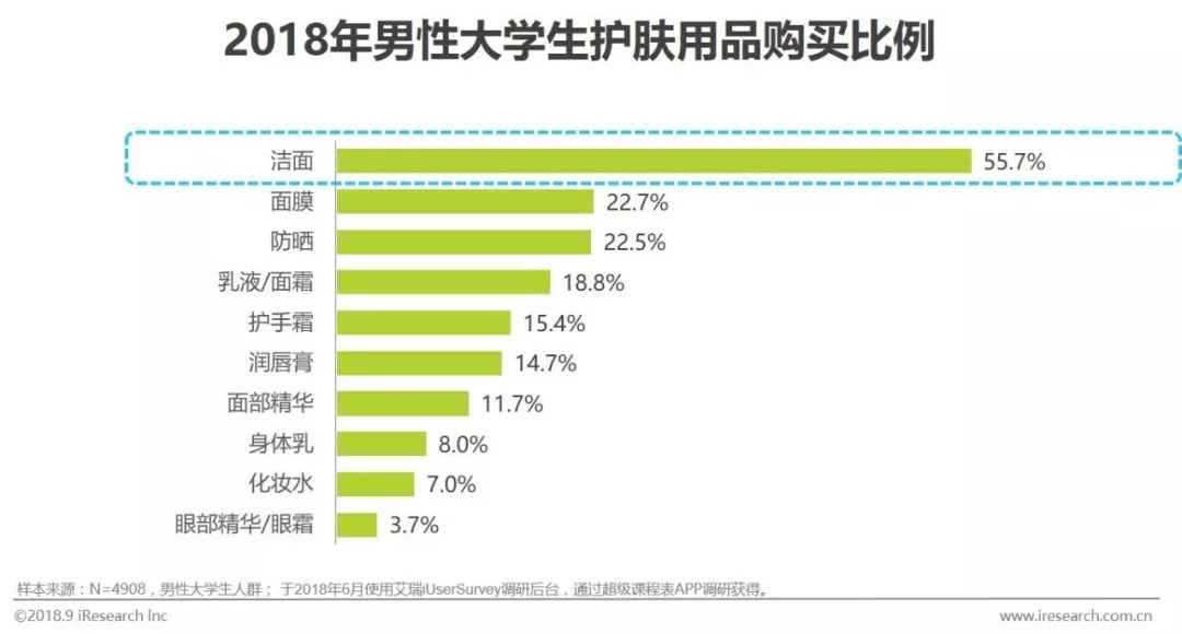 只有1.1%的2018年在校女大学生不曾用过洁面护肤产品。另外,女性大学生在洁面、防晒、面膜、面霜、润唇膏的购买比例相当,大部分女生开始使用全系列的基础护肤产品。受护肤需求以及经济能力等因素约束,面部精华、眼部精华/眼霜等精细化护肤产品在整体女大学生中的购买比例较低。