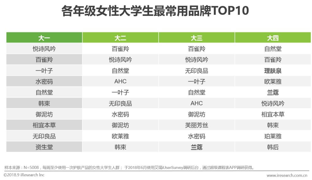 大学生中,尤其是女同学们,对大牌彩妆护肤产品及品牌有较高的认知,也会主动了解相关的推荐,只是碍于经济能力,使用的比例较低。随着对品牌了解的增加,高年级学生开始拔草大牌,大三、大四的女生常用品牌TOP10,开始出现兰蔻等的专柜品牌。