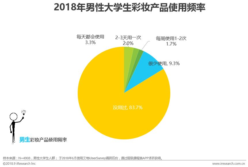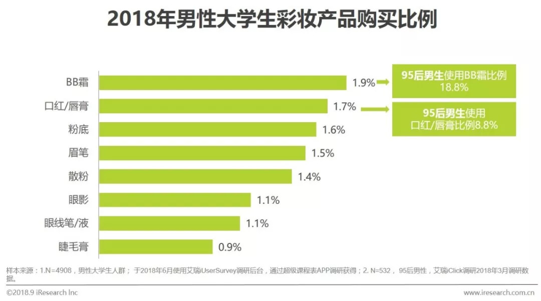 年轻一代整体男性大学生对彩妆开始产生兴趣,有16.3%曾经使用过彩妆产品,每周均会使用的比例达到7%。男生群体中,有1.9%购买了BB霜,1.7%购买了口红、唇膏,彩妆在男生中开始有了小部分的市场。95后男生调研数据显示,其BB霜使用比例达到18.8%,在未来几年男性大学生的彩妆需求将有小规模的爆发。