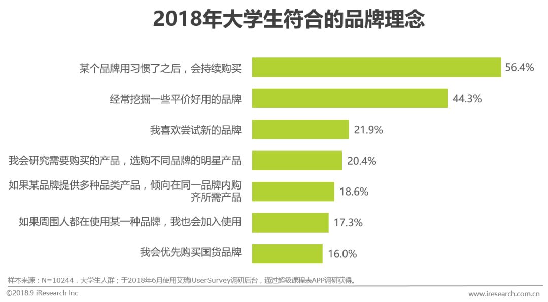 大学生持续回购某个品牌的比例为56.4%,主动挖掘平价好用的品牌比例为44.3%,品牌尝新意愿高。
