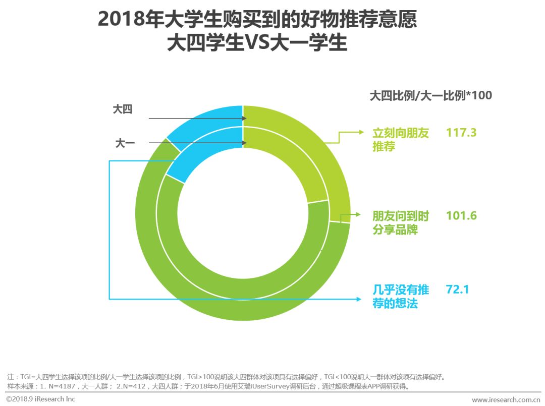 大学生对新产品和新品牌的接受度更高,同时也会在生活中传播使用体验,会指导长辈手机使用和潮流电子产品的使用。大四学生发现好用的产品之后立刻推荐的比例为26.5%,大一学生的比例为22.6%,两者相比的TGI为117.3。大四学生的品牌经验相对更为丰富,相对大一学生,更乐于推荐好用的产品。