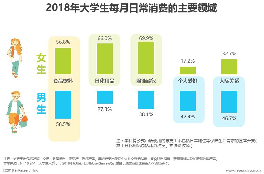 2018年在校大学生中,女生和男生在食品饮料、日化用品、鞋帽服饰等非必要支出领域上的消费结构有明显差异。女生对服饰鞋包以及沐浴洗发、护肤彩妆等日化用品的消费需求较男生强烈。而男生在人际关系以及个人爱好上的支出比重更高。但女生和男生对食品饮料的态度较为一致,食品饮料的重要程度,在男生和女生中均排在前三位。