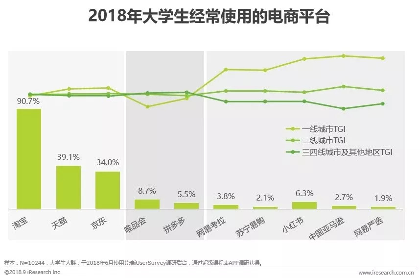 90.7%的大学生经常使用淘宝,其次为天猫和京东,二三线城市使用唯品会和拼多多的比例高于一线城市,一线城市使用网易考拉、苏宁易购、小红书、中国亚马逊和网易严选的比例明显高于二线和三四线城市。