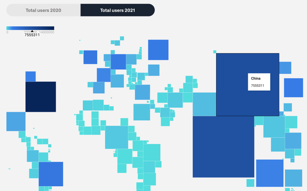 中国是GitHub无法忽视的市场,根据GitHub 2021年度报告,GitHub 开发者数量已超 7300 万,其中有 7555311 名开发者来自中国。在美国之外使用开源项目最多的 20 个国家和地区中,中国和印度占据前两名,但中国的开源项目数量远超印度。