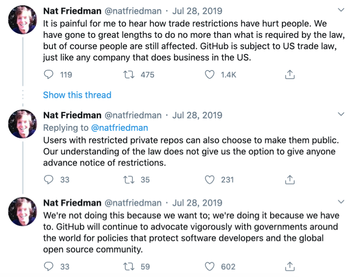 随后GitHub CEO Nat Friedman在推特上表达了歉意,但也表示这种限制措施在一定程度上是「势在必行」的。