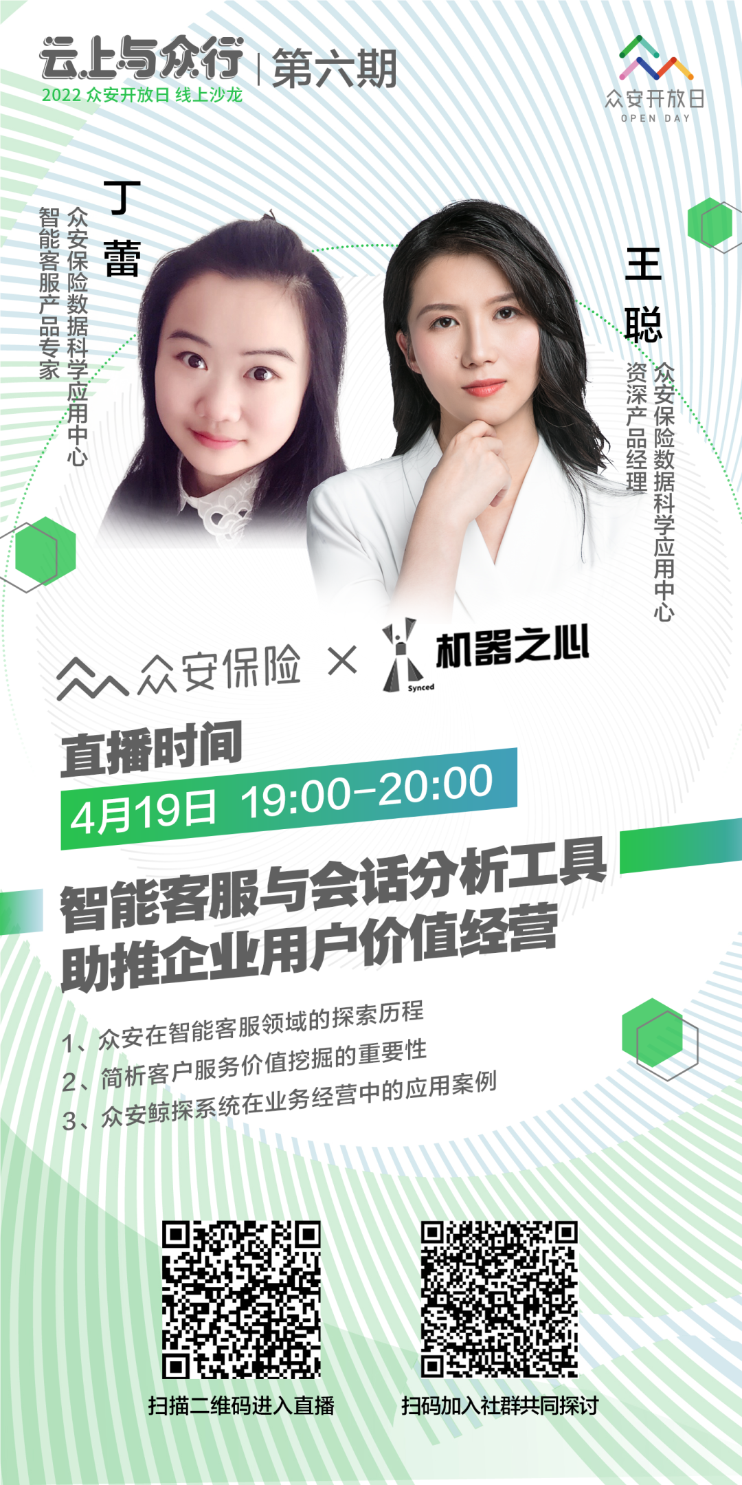 「2022众安开放日线上沙龙-云上与众行」第六期将于4月19日晚7点开启。两位众安保险客服产品专家将从技术角度,介绍交互价值挖掘在众安的落地情况,并详细阐述相关应用案例。