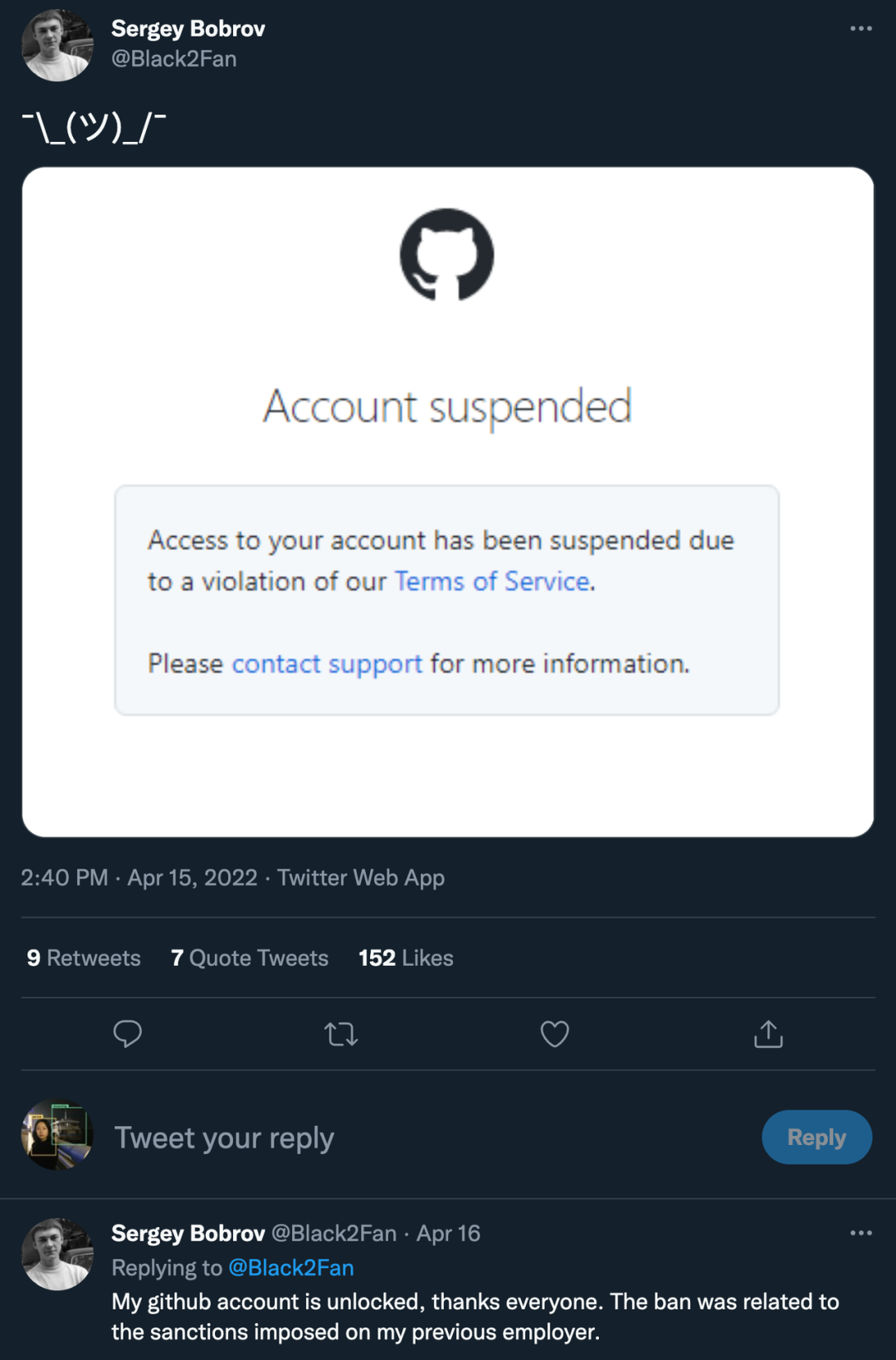一位开发者在推特上表示,在填写表格后,自己的账号得以解封。之前的封禁与他的前雇主有关。
