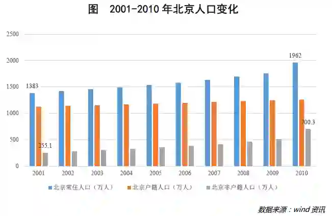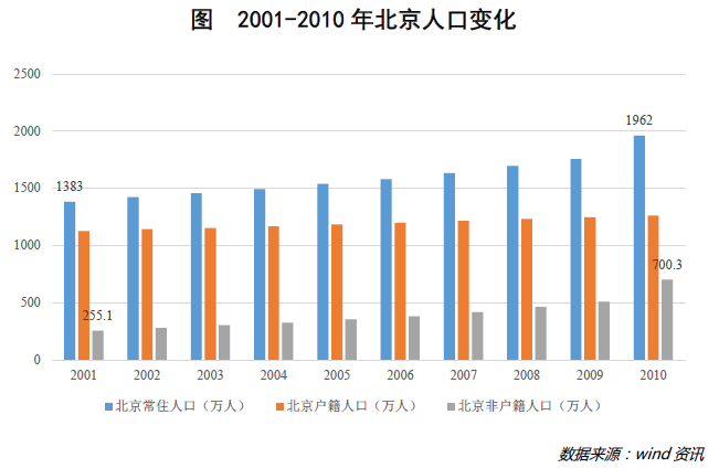 以北京为例,2010年,北京常住人口为1962万人,距离2000万大关仅一步之遥,同2001年相比,年均增加64.3万人。其中,2010年,北京非户籍人口700.3万人,占总人口的比重已经达到35.7%(参见下图)。改革开放至2010年,北京人口增加第一个500万用了23年,增加第二个500万仅用了9年——而这第二个500万中,近八成是非户籍人口。