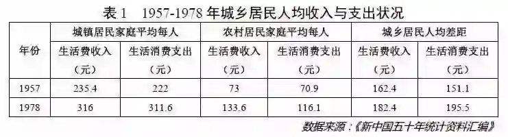 从消费水平来看,同样存在着类似的现象。以人均生活消费支出为例,1957年,城镇居民人均消费支出为222元,农村居民为70.9元;到了1978年,两项数据分别为311.6元和116.1元,差额从1957年的151.1元扩大至1978年的195.5元(参见表1)。