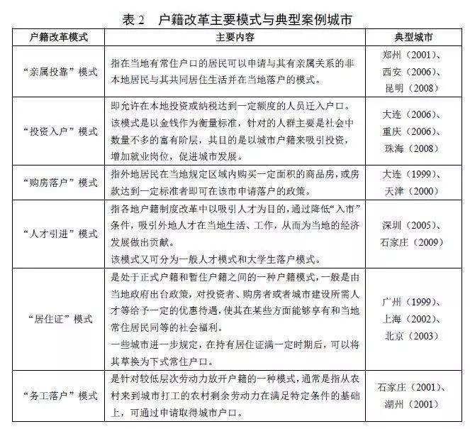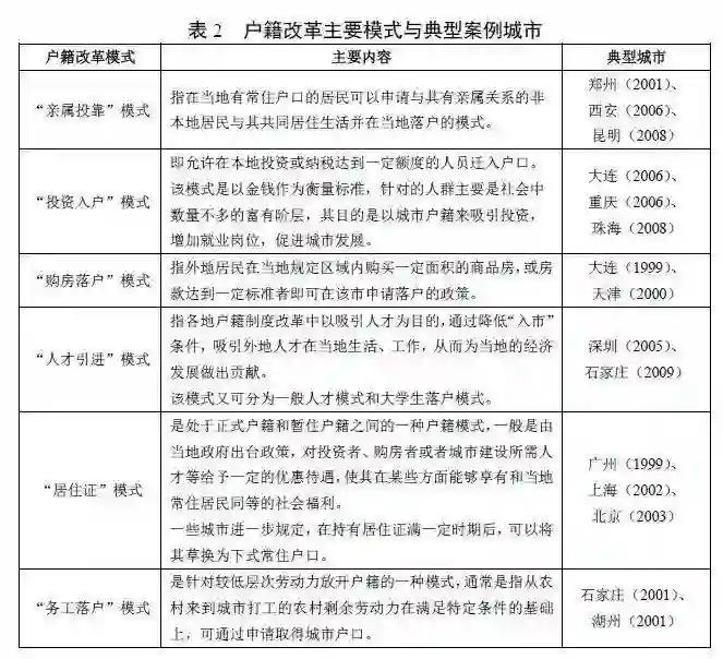 为此,2001年3月30日,国务院批转公安部《关于推进小城镇户籍管理制度改革的意见》,以小城镇为起点开始深入贯彻,这标志着我国户籍制度的改革步入加速时期。而后,全国各地都在大胆探索新的户籍改革方案,呈现出一片“百花齐放,百家争鸣”的局面(参见表2)。