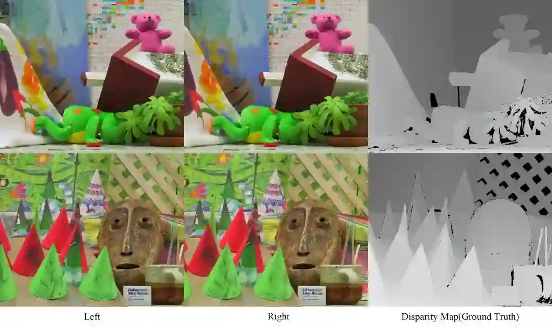 在SGM算法中,视差计算采用赢家通吃(WTA)算法,每个像素选择最小聚合代价值所对应的视差值作为最终视差,视差计算的结果是和左影像相同尺寸的视差图,存储每个像素的视差值,在影像内外参数已知的情况下,视差图可以转换为深度图,表示每个像素在空间中的位置,图1为双目立体像对的真实视差图示意图。