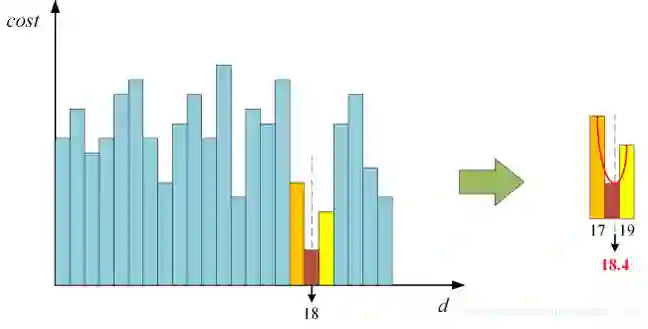 提高视差精度采用子像素优化技术,因为视差计算得到的视差图是整像素精度,在很多应用中都无法满足精度要求,SGM采用二次曲线内插的方法获得子像素精度,对最优视差的代价值以及前后两个视差的代价值进行二次曲线拟合,曲线的极值点所对应的视差值即为新的子像素视差值,如图4所示。