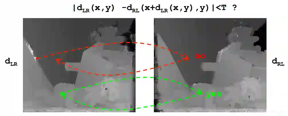 错误匹配直观的反应是聚合后某些像素在真实视差位置的代价值并非最小值,有很多因素能够造成这一现象的产生,如影像噪声、遮挡、弱纹理或重复纹理,以及算法的局限性。实际上目前还没有哪个算法能够完美的处理以上所有问题,所以错误匹配的剔除对所有算法都是有必要的。目前最常用的错误匹配剔除方法是左右一致性法(L-R Check),它基于视差的唯一性约束,即每个像素最多只存在一个正确视差。具体步骤是将左右影像互换位置,即左影像成为右影像,右影像成为左影像,再做一次立体匹配,得到另一张视差图,因为视差图中每个值所反映的是两个像素之间的对应关系,所以依据视差的唯一性约束,通过左影像的视差图,找到每个像素在右影像的同名点像素及该像素对应的视差值,这两个视差值之间的差值若小于一定阈值(一般为1个像素),则满足唯一性约束被保留,反之则不满足唯一性约束而被剔除。一致性检查的公式如式1所示: