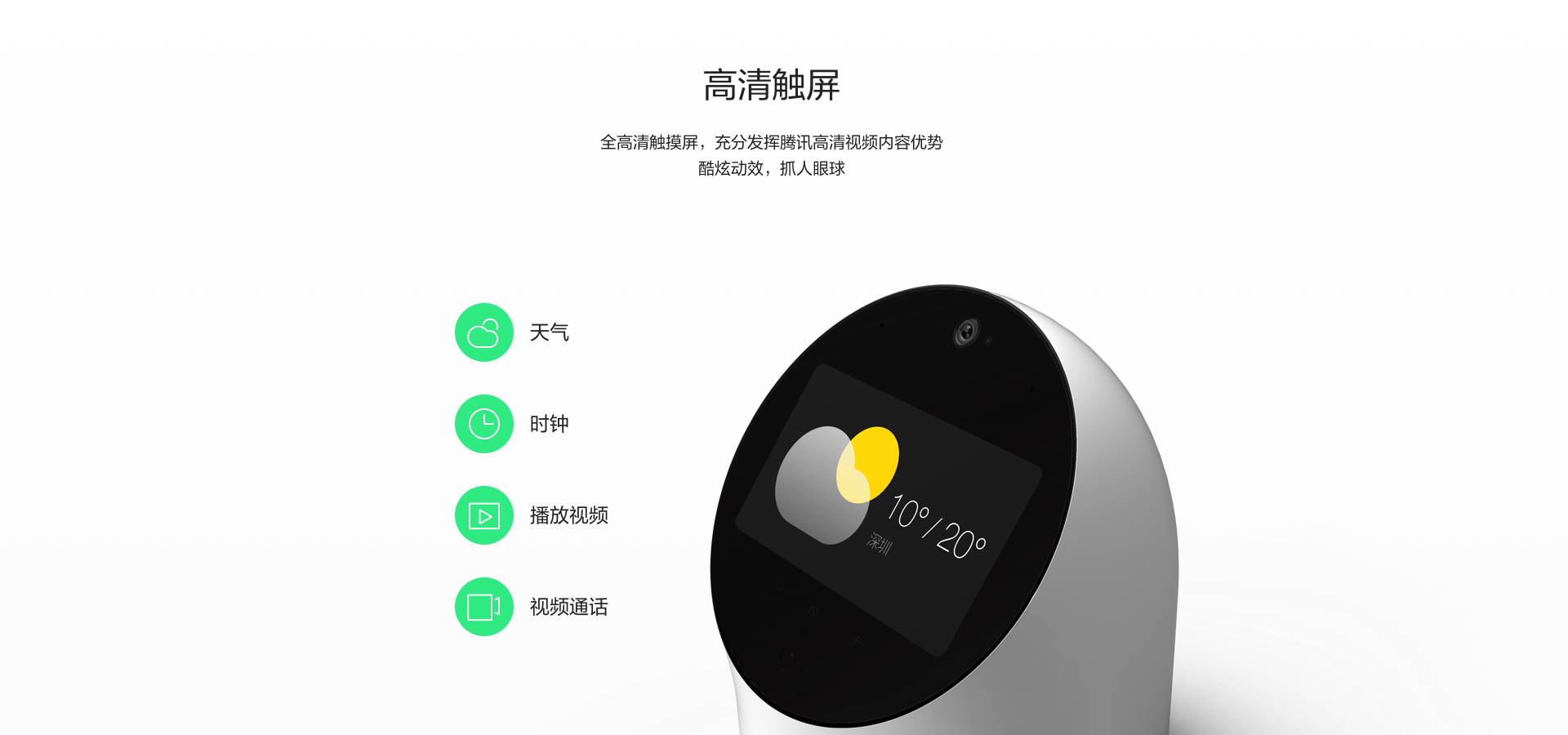 小 Q 我是市场上少有的带屏幕音箱,全高清触摸屏,可以做各类表情和炫酷动效,能随时随地播放腾讯高清视频内容,视频观看,视频聊天都能轻松做到。