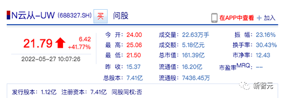 同时,按此次发行价以及发行后7.41亿股的总股本,云从科技在招股书上预测的初始发行市值接近114亿元。而在27日上午10点半左右,按每股价格算,云从科技市值已经超过160亿元。