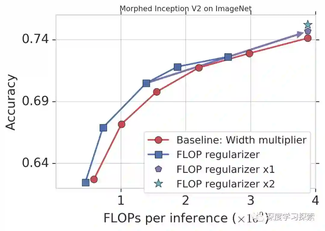作为演示,我们通过定位FLOP将MorphNet应用于在ImageNet上训练的Inception V2(见下文)。基线方法是使用宽度乘数来通过统一缩小每个卷积的输出数量(红色)来折衷精度和FLOP。MorphNet方法直接针对FLOP,并在收缩模型时产生更好的权衡曲线(蓝色)。在这种情况下,FLOP成本降低了11%至15%,与基线相比具有相同的精度。