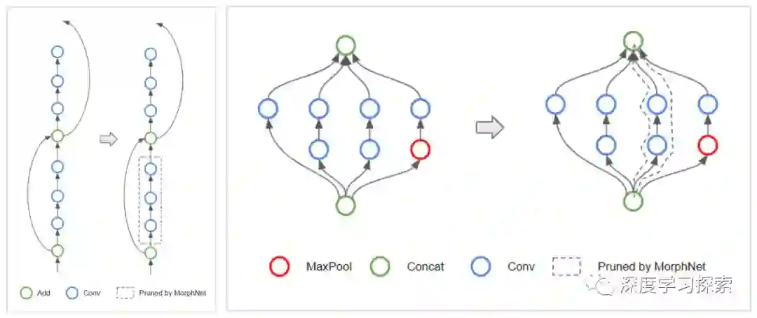 拓扑变形:当MorphNet了解每层神经元的数量时,该算法可能遇到一个特殊情况,即稀疏层中的所有神经元。当一个层有0个神经元时,这会通过从网络中剪切受影响的分支来有效地改变网络的拓扑。例如,在ResNet架构的情况下,MorphNet可能会保留跳过连接但删除残余块,如下所示(左)。对于Inception风格的体系结构,MorphNet可能会删除整个并行塔,如右图所示。