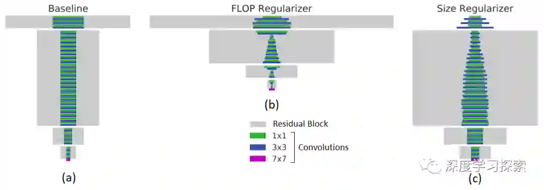 MorphNet在针对FLOP(中心,减少40%FLOP)或模型大小(右侧,权重减少43%)时生成的结构有很大不同。