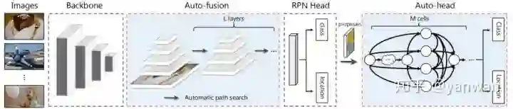 如下图示,AutoFPN的创新点在Neck和Head网络中,Neck是针对backbone的特征先做Auto-fusion操作,而Auto-head使用NAS技术搜索得到一个网络用于分类和回归。