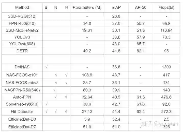 最后,一张图比较这几种方法,可以看到EfficientNet-D0在非常小资源的情况下,取得了32.4的mAP,效果真的很好。Detection+NAS拟合的能力确实强悍。