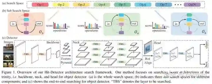 Hit-Detector是第一个同时搜索检测网络的backbone、neck和head的方法。采用的是**Differentiable NAS的搜索方式。**结构如下所示: