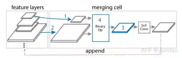merging cell的机制是:从现有的feature layers中任意选取两个feature map,并选择输出的分辨率,然后选择此次的Binary Op,将选择的两个feature map融合并按照上一步选择的分辨率生成新的feature map。