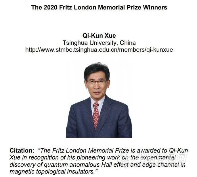 菲列兹·伦敦奖评奖委员会日前宣布,2020 年度菲列兹·伦敦奖将授予清华大学副校长、北京量子信息科学研究院院长薛其坤院士、美国阿贡国家实验室 Vinokur 博士和德国马普学会固体化学物理研究所 Steglich 教授。