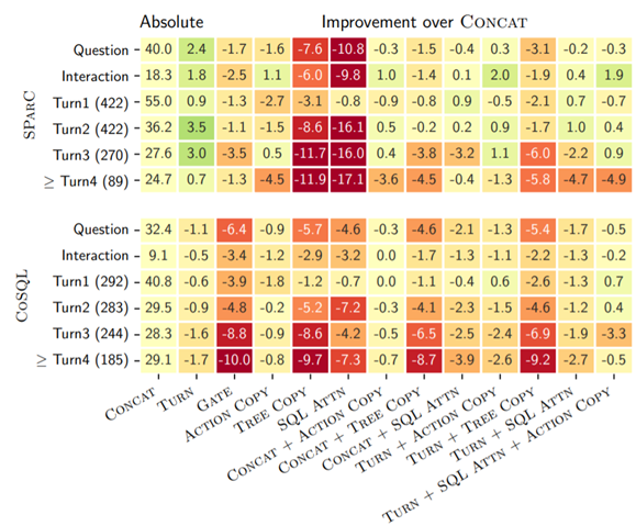 至于第二类方法,SQL ATTN 引入了一个 SQL 编码器,用其编码上轮 SQL 语句得到的表示作为解码器的额外输入,从而使得解码器利用到历史 SQL 的信息。ACTION COPY 和 TREE COPY 的思路则与复制网络类似,它们都注意到一个对话解析场景的典型特点:当前轮产生的 SQL 语句,往往与所依赖上文的 SQL 语句有较多重叠。例如图1的 S2,它的主体与上轮产生的 S1 相同。为了充分利用这个特点,ACTION COPY 允许模型复制上轮已产生的、与当前非终结符兼容的语法规则。而 TREE COPY 则允许模型一次复制多个语法规则,这些语法规则可以对应到 SQL 语句抽象语法树的一颗子树。