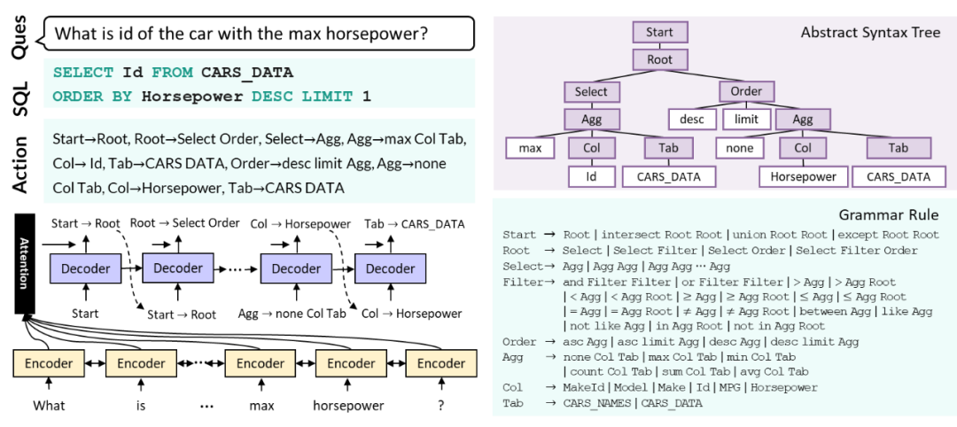 该动作序列可以通过从左至右深度遍历 SQL 语句 SELECT Id From CARS_DATA ORDER BY Horsepower DESC LIMIT 1 的抽象语法树(abstract syntax tree)得到,如图中的紫色部分所示。与普通的序列到序列模型将 SQL 语句单纯视为词序列不同,基于语法的语义解析器将 SQL 语句视作动作序列。通过融入 SQL 语法的知识,其生成的任意动作序列都可以转换成一个语法正确的 SQL 语句。