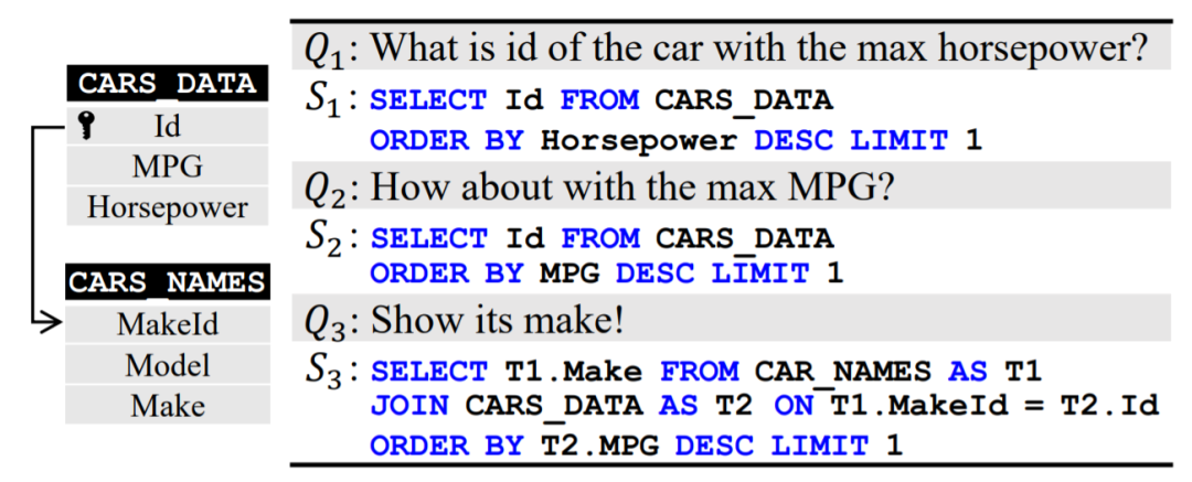 2019年,在 Excel 发布的一项新功能中,没有编程背景的用户也能通过自然语言零门槛地进行数据分析,洞悉数据价值。这项功能背后的技术就是语义解析(semantic parsing)。语义解析是自然语言处理中的一个重要领域,它旨在赋予机器理解人类语言,并将其翻译成指定编程语言的能力。而对话式语义解析(semantic parsing in context),则允许用户通过更自然的多轮对话的方式来渐进地分析数据。在这种场景中,我们希望机器不仅能理解上下文无关的问句(如图1中的 Q1),也能理解语义依赖于上下文的问句(如图1中,Q2 省略了语句主语、Q3 中的代词 its 指代了上文中的内容)。事实上,语义解析是个很大的领域,理论上语义解析模型可以将自然语言转换为各种编程语言。而本文主要关注数据分析领域,即把自然语言转换成结构化查询语句(structured query language, SQL,如图1中的 S1)的任务。