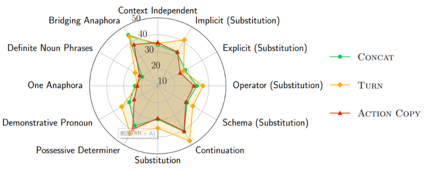 我们将 SParC 的开发集作为样本,以 CONCAT、TURN 和 ACTION COPY 这些典型的上下文建模方法为例,分析了它们在各种上下文现象中的结果(见图5,图6)。结果显示,所有方法都在两种细粒度的指代现象上受挫:限定性名词短语(definite noun phrases)和一型回指(one anaphora)。这两种现象在代词指代上都需要较为复杂的上下文分析,目前的上下文建模方法都无法准确推理。