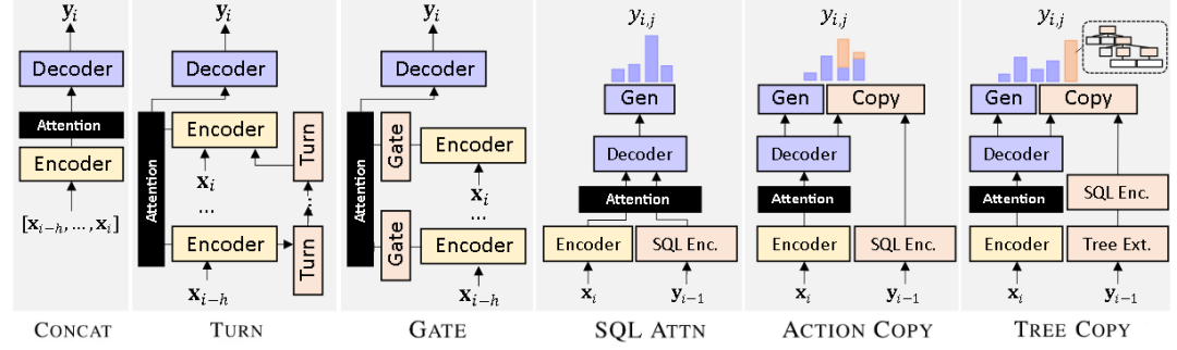 如图3所示,左侧三类属于前述的第一类建模方法(将部分用户的历史问题作为上下文),而右侧三类则属于第二类(仅以上轮产生的 SQL 作为上下文)。其中,CONCAT 方法是最直观、也是最简单的上下文建模方法,它直接将最近 h 轮问句拼接在一起作为模型的输入。但这种简单的建模丢失了句子粒度的依赖信息,为了更精确地建模句子间的依赖,研究者们提出了 TURN 方法。TURN 在原有的编码器基础上引入了一个新的编码器,该编码器以每轮的句子表示作为输入,通过 LSTM 编码句间的依赖关系,并将句子粒度的隐藏状态作为下一轮句子编码的输入。类似地,GATE 方法注意到不同上下文重要性不同的特点,在解码器的注意力上加入了可学习的上下文的权重,从而使得模型能够有选择性地依赖重要的上下文来产生 SQL 语句。
