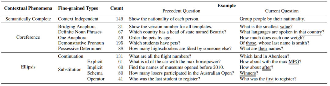 目前已有许多建模上下文的方法,但学术界对于“哪个上下文建模方法最有效”这个问题尚无定论。许多研究问题也都值得探索,比如“这些方法擅长解决什么类型的上下文现象”,“它们目前还无法解决什么类型的上下文现象”等等。受此启发,我们试图通过一项细粒度的探索性研究来回答这些问题。相信如果这些问题可以得到解答,那么对话式语义解析领域未来的发展脉络会变得更清晰。