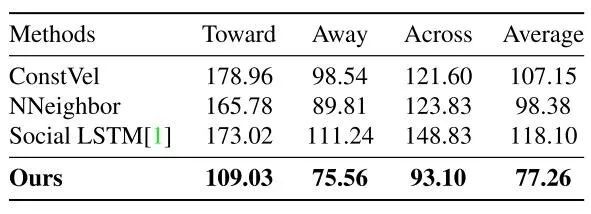 测评方式方面,本文采用了与[6]中相似的方式,使用 Final Displacement Error (FDE) 作为测评指标。FDE指标即最终预测轨迹和最终实际轨迹之间的L2距离。为了更加精细的评估,该数据集还把行人轨迹分为了1) toward 2) away 3)across三个子集,分别计算了 FDE 以及 3 个子集的平均 FDE。