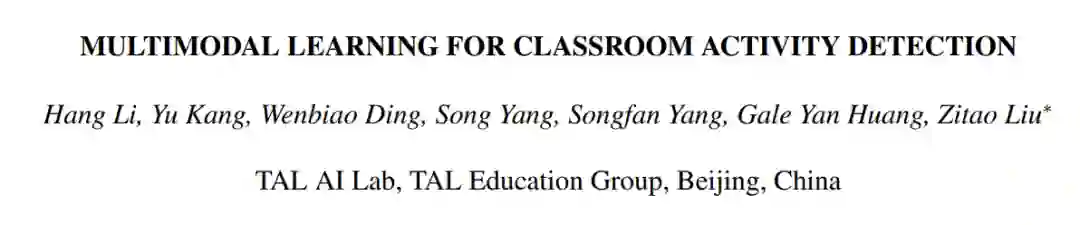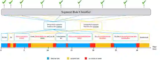 通过课堂音频或者视频对于老师和学生的课堂行为研究具有很长的历史,例如,Owens[1]等人提出了DART系统(Decibel Analysis for Research in Teaching),用来分析预测课堂中花费在单独说话(如:演讲),混合说话(如:讨论)或者无人说话(如:思考问题)等活动上的时间。Cosbey[2]等人通过使用RNN网络对DART系统的表现进行了提升。Mu[3]等人提出了ACODEA框架(Automatic Classification of Online Discussions with Extracted Attributes)用来对在线讨论进行全自动的切割和分类。与我们的研究最相似的,是Wang[4]等人提出的LENA系统,他们基于此系统对课堂中的三种活动进行了识别:教师讲课、课堂讨论以及学生小组活动。我们与Wang等人的研究的不同之处在于:我们提出了一种全新的多模态注意力机制,用于在真实课堂环境中进行课堂活动检测。而Wang等人的研究仍然需要教师全程佩戴LENA系统,从而可以通过音量与音色的差异来区分学生和老师的说话时间段。对于本文定义的目标任务,一种简单直观的方法是将说话人分离与说话人角色识别作为两个独立的模型,采用两阶段结合的方式进行连接。这也是在已有研究中被实践且证实有效的方法。然而,这种两阶段方法存在着一些明显的弊端:首先,不同阶段的模型所产生的误差会在整个预测流程中进行积累,导致最终结果的不准确;其次,两个独立任务分别优化是非常缺乏效率的,单一阶段的优化并不能完全保证最终结果的提升;最后也是最重要的,由于两个阶段的分离,多模态信息之间的交互被完全忽略了。 3
