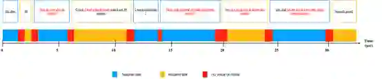 图1(a):课堂活动检测数据形式在正式开始介绍我们的方法之前,首先描述一下本文实验所基于的数据形式。首先,我们的音频数据均来源于教室内单一的麦克风,收录了整节课堂的完整录音。我们的文本数据来源于使用自动语音识别(ASR)系统对麦克风收录得到的课堂录音进行转录得来。图1(a)中展示了一段学生与老师的对话数据,图中文本框的颜色区分了不同的说话人,蓝色文本框表示老师说话内容,黄色文本框表示学生说话内容。从图中我们可以看出,对话的内容包含大量的信息,其中一些句子可以非常容易的分辨出说话人的角色。以第三个句子为例,该说话人说:“How is your day in school”,从句子的内容可以很容易的判断出该说话人应该是老师。然而,并不是所有的句子都像这样容易判断,比如图中对话的前两句问候语句,很难分辨出说话人是老师还是学生。