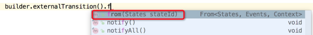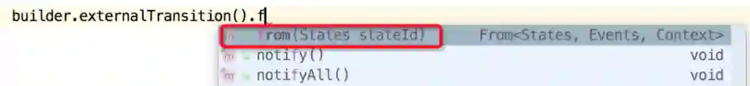 class TransitionBuilderImpl<S,E,C> implements ExternalTransitionBuilder<S,E,C>, InternalTransitionBuilder<S,E,C>, From<S,E,C>, On<S,E,C>, To<S,E,C> {...@Overridepublic From<S, E, C> from(S stateId) {source = StateHelper.getState(stateMap,stateId);return this;}@Overridepublic To<S, E, C> to(S stateId) {target = StateHelper.getState(stateMap, stateId);return this;}...}