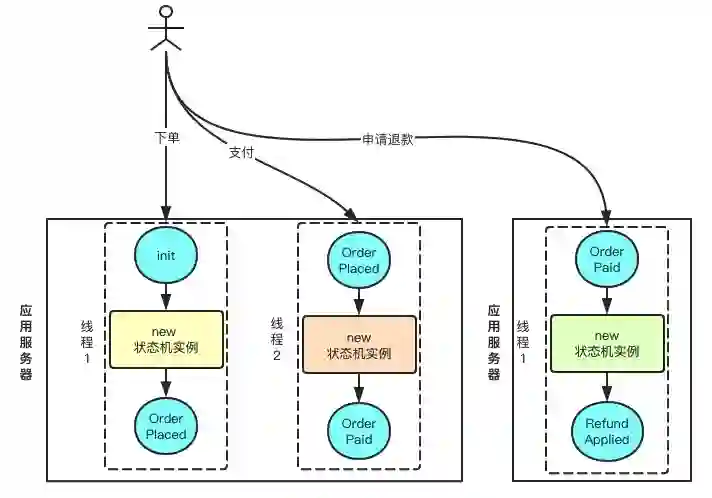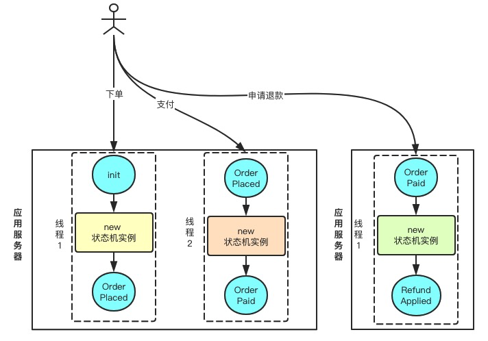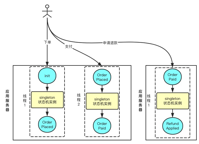 状态机本身需要是 Stateless(无状态)的,这样一个 Singleton Instance 就能服务所有的状态流转请求了。