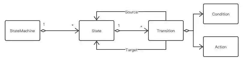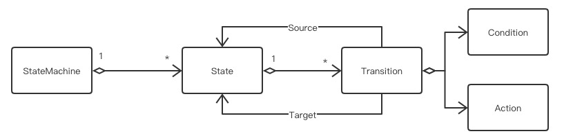 //StateMachinepublic class StateMachineImpl<S,E,C> implements StateMachine<S, E, C> {private String machineId;private final Map<S, State<S,E,C>> stateMap;...}//Statepublic class StateImpl<S,E,C> implements State<S,E,C> {protected final S stateId;private Map<E, Transition<S, E,C>> transitions = new HashMap<>();...}//Transitionpublic class TransitionImpl<S,E,C> implements Transition<S,E,C> {private State<S, E, C> source;private State<S, E, C> target;private E event;private Condition<C> condition;private Action<S,E,C> action;...}
