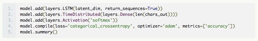 这就得到了简单的编码器模型。我们将构建一个类似的层作为解码器。但上面的代码片段的输出是个 2D 数组。我们通过使用方便的 RepeatVector 层重复输出时间数量 max_len_y,将其转换为 3D 张量,并作为下一个 LSTM 层(解码器)。现在,我们在这个 LSTM 中使用 return_sequences = True 选项来输出隐藏状态序列,我们需要使用这些信息进行预测。为此,我们使用一个 TimeDistibuted 密集层,它输出一个长度为 max_len_y 的矢量,我们使用 softmax 激活函数来选择最有可能的字母。为了快速了解 TimeDistributed 层的目的,请参阅 Jason Brownlee 撰写的博文:How to Use the TimeDistributed Layer for Long Short-Term Memory Networks in Python。